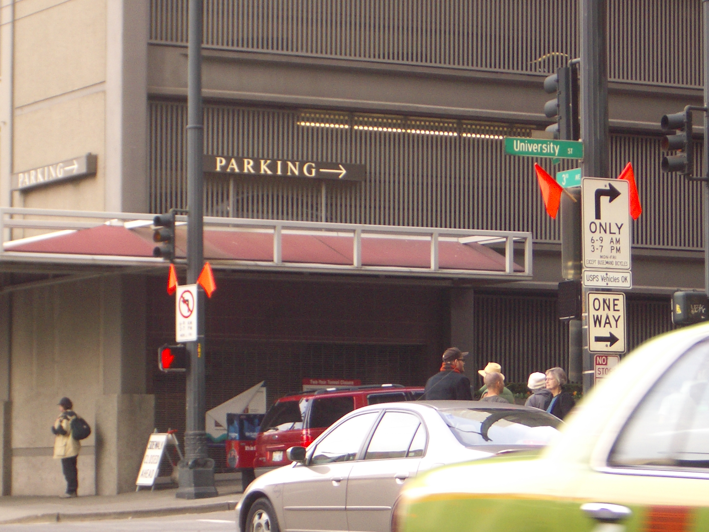 Apparently, they have changed the rules on 3rd Avenue in the last six weeks (before I was stopped) so that right turns are only allowed from 6-9a and 3-7p. I didn't see these signs since during the entire time I was on 3rd Avenue before I was stopped (about two blocks), I was driving to the left of and behind large buses, which blocked my view of the signs at the corner of the intersection as well as the top signs. (Note that the change regarding the lanes was due to the downtown bus terminal being redone, which has resulted in a LOT of bus traffic on 3rd Avenue especially during rush hour.