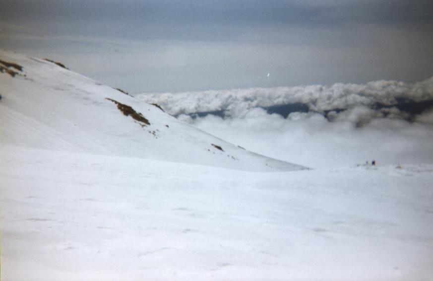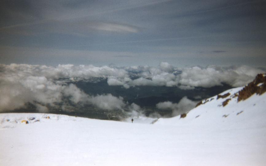 I had an extremely fun time going down. I was so tired that I just lay down in a chute and glissaded pretty much all the way to Horse Camp. There was only one time when I felt I was going too fast and had to use my ice axe to arrest myself (only to prevent myself from bumping into the person in front me). A couple of times, I was in near white-out conditions though it was never scary because the path down was very clear. At the end of it all, I ran into Tanya and together we slowly walked back to the car where Jason already was waiting (having glissaded in a non-standard fashion).
